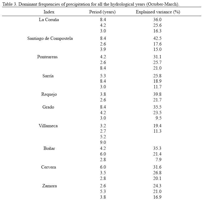The results of SSA for precipitation using hydrological years are shown in Table 3. Five stations share a common oscillation period of 8.4 years, very similar to that of 8.3 years found in NAO index. The 2.6 years cycle seems to have physical significance, since it appears in most of the precipitation series. The link with NAO is even more clear when using only years corresponding to positive phases of NAO (Table 4). In this case, the 8 years cycle is present in all the stations except Ponteareas, Requejo y Villameca. The other repeated cycle (2.6 years) is not related to NAO, however it appears in almost all the stations, so we have to consider it as an important feature in Galician precipitation.