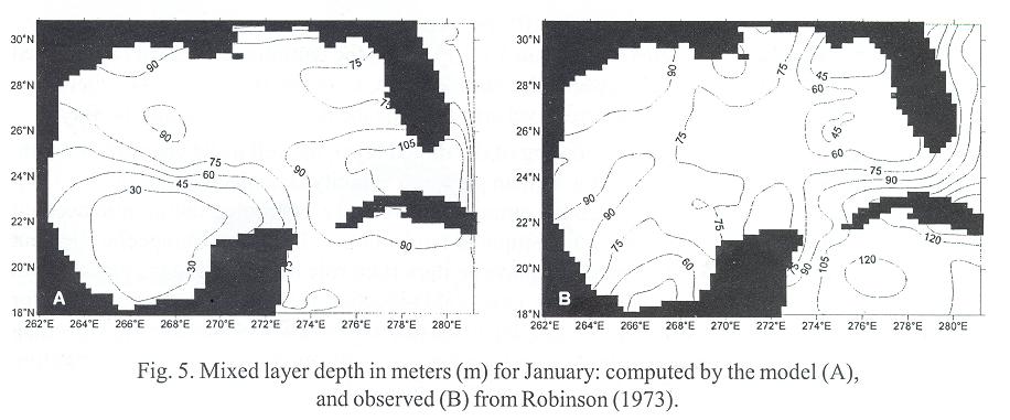 Figure 5 shows the MLD, in meters, computed for January (Part A) and the corresponding observed values (Part B). Figure 6 is as Figure 5 but for July. For January, the model yields minimal values of MLD in the Campeche Bay and in the North of Florida and yields maximal values in the Texas Shelf between Corpus Christi and Mississippi Delta. Also it yields maximal values to the south of Florida and around the island of Cuba, which has certain agreement with the observations (Fig. 5, Part B). For July the thermocline is considerably shallower than in January. In this case the result of the model is between about 15 and 30m in the Gulf of México and of the order of 45m in the northwest portion of the Caribbean Sea, which is also in agreement with the observations.