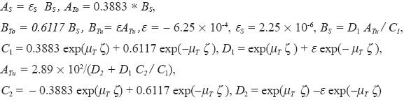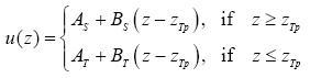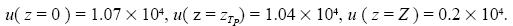 The constants are given by AS = 1.938, BS= -1.231, AT = 0.707, BT = - 4.42 X 10-4. At the upper boundary, the BS-term can be neglected and we obtain u(Z) = 1.291 x 103. Going downward we observe a fast decline of the solution corresponding to the AS-term until near the tropopause where the BS-term comes into play. At the tropopause we have u(zTp) = 0.707, and then a slow decline until we reach u(0) = 0.248 at the lower boundary.