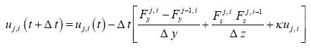 and the discrete values uj,i of the mixing ratio are given at the midpoint of the cell. In order to improve the discrete boundary conditions in our simplified case, we introduce additional fictive outer points. We denote by Fyj,i the discrete value of Fy calculated at the midpoint of the right boundary of j, i- th cell and by Fzj,i the discrete value of Fz calculated at the midpoint of the upper boundary of the j, i-th cell. Therefore, we obtain the following discrete equation for the j, i-th cell: