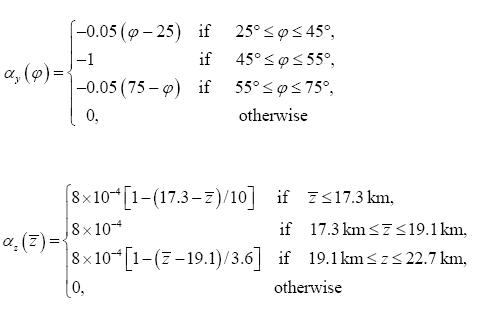 We use simplified data taken from the distributions employed in the 2-D box model of the MPI Mainz (Brühl, 1987; Fiebig-Wittmaack and Börsch-Supan,1994). Because of symmetry with respect to the equator we consider only one half sphere with y = 0 corresponding to the equator and y = Y = 9990 km corresponding to the north pole; z = 0 and z = Z correspond to altitudes of 2 km altitude above ground (just above the planetary boundary layer) and 23.6 km altitude (near the ozone layer), respectively. We introduce the altitude above sea level