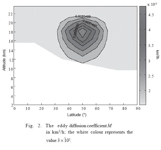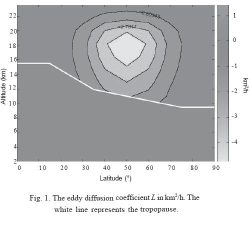 may be interpreted as the slope of the main diffusion direction; thus this deviates from the horizontal in the stratosphere between 25° and 75° latitude. Note that a = 0 near the upper boundary has been introduced artificially in order to simplify the upper boundary conditions.