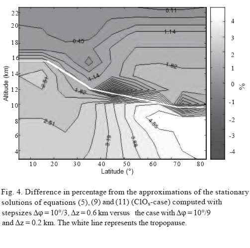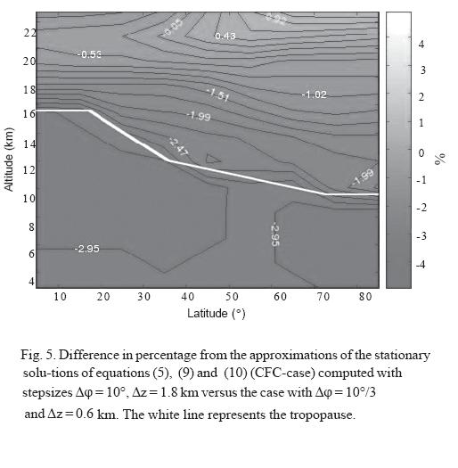 Stationarity is achieved by applying (14) over a sufficiently large time interval, until the computed values do no longer change significantly in time (nearly 19,000 iterations were needed in the " CFC case" and nearly 30,000 iterations were needed in the "ClOx case"). We shortly describe how the discrete solutions look like: In the "CFC case", along vertical lines, the mixing ratio decays upwards in a nearly piecewise linear fashion, from values near 9 units at the lower boundary to values near 2 units at the upper boundary, with rather small differential quotients in the troposphere (0.05 units per km near the equator to 0.04 units near the pole), and larger ones in the stratosphere (from 0.8 to 0.5 units per km); along horizontal levels one sees a maximum of the mixing ratio at the tropopause. In the "ClOx case" there is an exponential decay downwards of the tracer's mixing ratio by factors between 0.5 per km (near the equator) and 0.6 per km (near the pole). In the troposphere the decay is much smaller (from 0.85 to 0.9 per km); along horizontal levels one sees a minimum of the mixing ratio at the tropopause.