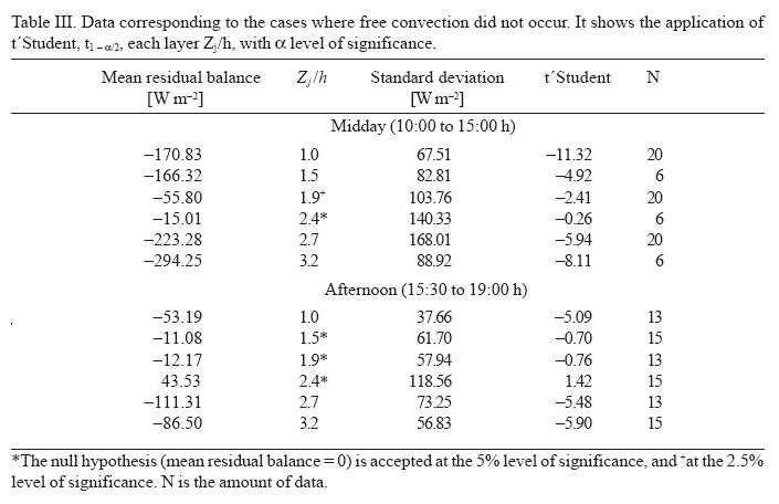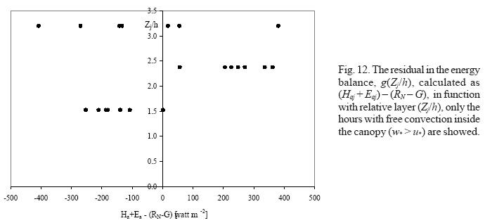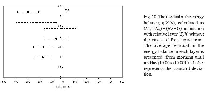 Mixed convection conditions occurred from morning to midday (u* > w*) inside the canopy and weak unstable conditions above it. The closure of balance energy equation is between Z/h ˜1.9 to 2.4. The enclosure for Z/h < 1.9 was associated with inhomogeneous temperature in the soil of the canopy. The temperature differences between soil under the plants and bare soil between rows can arrive to 20 °C. During the late morning in short periods, the bare soil between the rows reached extremely high temperatures and low wind speeds occurred above the canopy (u*< 0.16 ms1), and thus free convection inside was the dominant transport regime (w*>u*) during some hours. Z/h = 1.5 and 2.4 were different from zero and an extremely large variability was evident for the Z/h = 3.2 layer, no finding the equilibrium layer. Strongly advective conditions prevailed during the afternoon, manifested as an increase in the stability of the uppermost measured layer, and propagated slowly downwards. The closure of balance energy equation for the stable conditions above the canopy was between Z/h ˜ 1.5 and 2.4. The lowering of the equilibrium boundary for stable conditions was ascribed to the high wind speed and the fact that horizontal gradients in the soil surface temperature were small due to canopy shading, prevailing mixed and forced convection inside the canopy. In these cases, the inhomogeneous canopy did not have influence at the height 1.5 h. The residuals were significantly different from zero for the uppermost layers (Z/h = 2.7 and 3.2) during these periods.