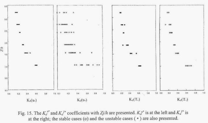 Kdu* is defined by equation (A3) with (A4) and (A5) to the unstable and stable cases, respectively. While as KdT* is defined by equation (B2) with (B3) and (B4) to the unstable and stable cases, respectively. Figure (15) shows the Kdu* and KdT* values with Z/h, the maximum occurs closer to canopy top, Z/h=1. According to our data δd/d=0.13, the mayor relative errord are 16 and 23% in unstable and stable conditions at Z/h=1. The error decrese, being 10% at Z/h=1.9. These results affirm that the error in Ha, due to the error in d, is bigger near the canopy top and it decreases with height.