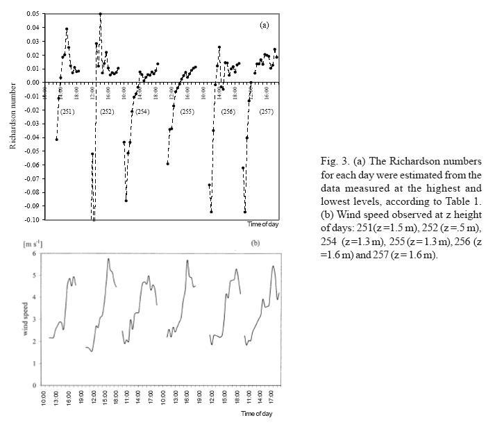 < 0.01. The Richardson number was estimated from the data measured at the highest and lowest levels (i = 4, j = 1, see Table I) and the computed Ri are presented in Figure 3a. The common feature is one of unstable conditions before noon and stable conditions in the afternoon. High wind speeds occur during the afternoon as result of the breeze, (Fig. 3b).
