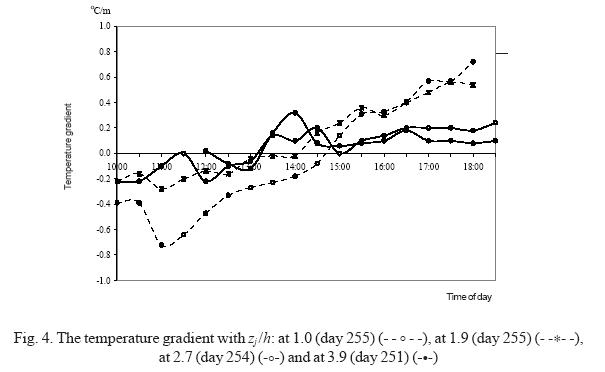 A typical example of the behaviour of the gradients is presented in Figure 4. The sign of the temperature gradient changes close to midday. The gradients were largest in the lowest layers and exhibited less change in the highest layers. The sign first changed in the highest layer, one hour thereafter in the intermediate layer (Zj/h = 1.9), and two hours later in the lowest one. A similar behaviour was observed when the Bowen ratio machine was installed at different heights. The inversion temperature gradient in the afternoon was observed constant at the top (Fig. 4, Zj/h = 3.9).