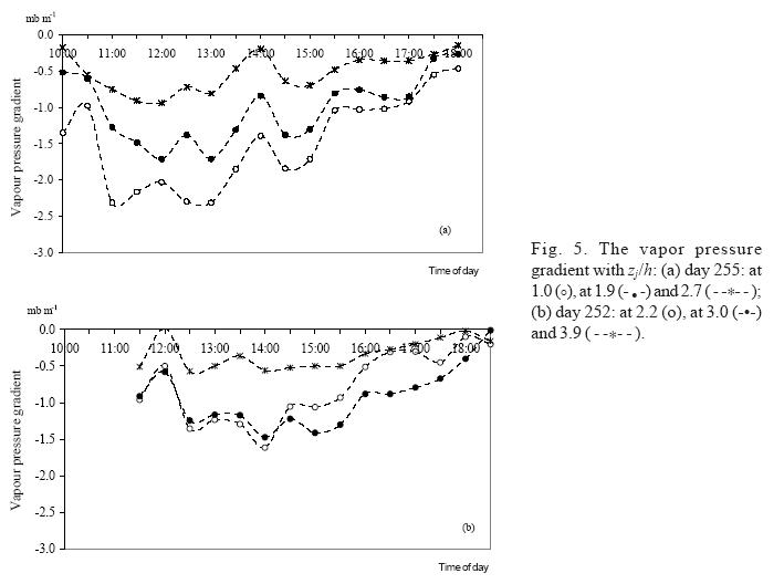 The vapor pressure gradient above an actively transpiring crop should diminish with height and this was observed everyday. Day 255 is presented as an example in Figure 5a (Zj/h = 1, 1.9 and 2.7). When the tower was placed higher, for example, on day 252 (Fig. 5b), the gradient at Zjh = 3 was larger than at Zj/h = 2.2. This occurred after 14:00 h and it could be due to the influx of hot dry air.