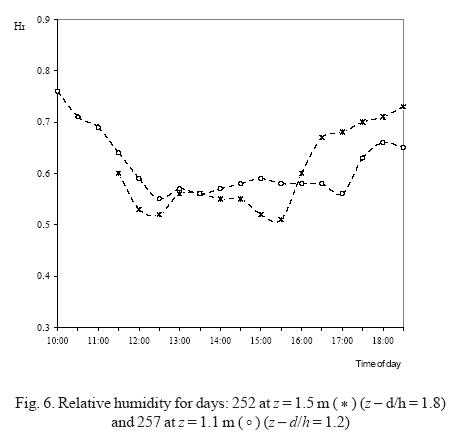 In Figure 6, the relative humidity is presented for days 252 at z = 1.5 m (Z/h = 1.8) and 257 at 1.1m(Z/h= 1.2). In each case, there isa "plateau" in the relative humidity from 12:00 until 16:00 h (day 252) or 17:00 h (day 257) due to irrigation. A minimum relative humidity close to 30% (14:00 h) was measured at the meteorological station outside the field and this increased monotonically up to 8090% at night. The "plateau" could not be observed.