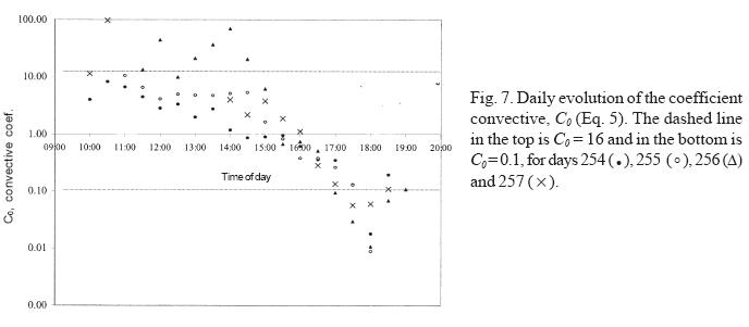 We evaluated the friction velocity, u*,with the lowest level of wind speed observed. The diurnal variation of estimated values of C0 (Eq. 5) for days 254, 255, 256 and 257 are presented in Figure 7. A few values with C0>16 (free convection conditions) are evident during brief periods of extremely low wind speed, before 15:00 h. The lowest values of C0(<0.1) were measured during the afternoon and coincide with the periods during which high wind speeds occurred. This is a common feature in the area during summer time due to the influence of the breeze. The error propagation to C0(see 3.4.) is: