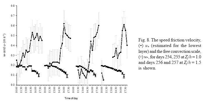 According to equation (28), δu*/u* is < 1 (Fig. 17) when Z/h < 2.4, except in free convection cases (see Z/h = 1.5). We calculate δu*˜ 0.7 ms1 if Z/h < 2.4 and δT*˜ 0.6°C are the greatest values observed.