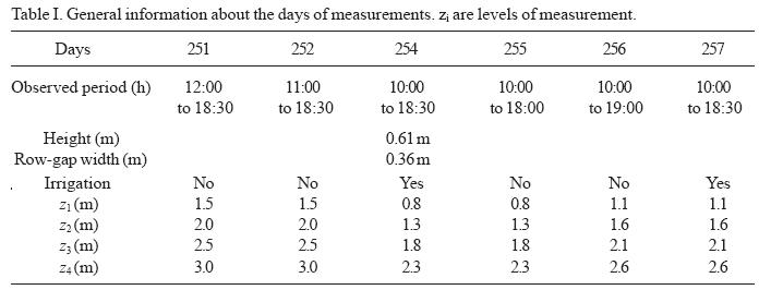 Jacobs et al. (1994) showed that a decoupling between aboveand withincanopy processes develops under conditions of low speed winds at night. Moreover, inside of the canopy, the relatively warm floor generates free convection cells. This argument can extend to those daylight hours during which low wind speed, high radiation prevail (late morning and midday) and high temperatures in the bare soil between the rows crop occurs, resulting in strongly unstable conditions inside the canopy. We observed that the temperature differences between the noncovered soil surface (Tis) and the air temperature measured at the lowest level above the canopy (Tis Ta) are of the same order of magnitude as the differences between the former and the covered soil surface temperature, Tsc (under the plants), Th = (Tis Tsc). This fact supports the view that convective activity could take place during the previously defined time intervals.