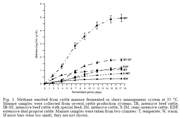 MEF from cattle manure fermented in a simulated SMMS, for cattle production systems and climates described in Table I, are shown in Table II. It can be seen that values range from 0.57 kg CH4 /head • year for EDP systems to 7.05 kg CH4 /head • year for IMT systems, pointing out the key role of diet composition.