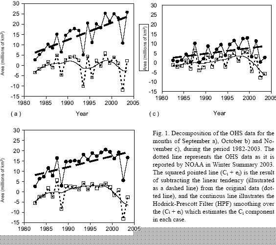 Therefore, in order to contribute to the understanding of the evolution and the origin of such discrepancies between models and observations, we examine here the longterm OHS behavior. With this goal in mind, we analyze the monthly average of the Antarctic OHS, for the months of September, October, and November, in the period 1982 to 2003, as reported by the National Oceanic and Atmospheric Administration (NOAA) National Weather Services Climate Prediction Center for the years 1982 to 2003 (Southern Hemisphere winter summary 2003, Figures 4b4c, available at http://www.cpc.ncep.noaa.gov/products/stratosphere/winter_bulletins/sh_03/index.html.