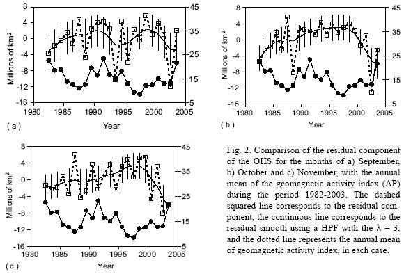 Both results (for OctoberNovember and September) are in good agreement with the evolution inferred on the basis of OHS trend analysis, performed over subsets of length 5, 6, and 7 years, for the same period of analysis (ÁlvarezMadrigal and PérezPeraza, 2005). However, at present it is not clear the existence of the quasicyclical pattern in the residual component for September.