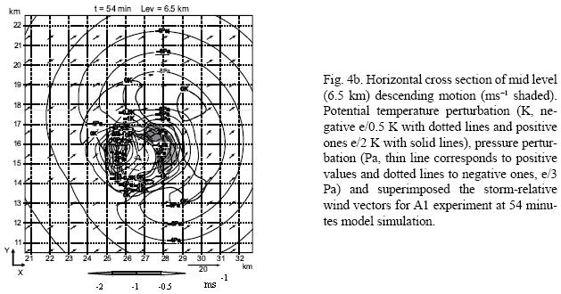 Lately, at the beginning of the dissipation stage (58 minutes of simulation time and 13:24 CST accordingly KW91), both the first signal of divergence at the surface and a well defined pressure dome at lower levels are clearly noticeable in Figure 5a. At this time, the vertical extension of positive BT values within the cloud is increasingly reduced, and in the upper levels in the anvil zone, the cloud becomes dominated by negative values associated with the P (Fig. 5b). It is worth to mention that this downdraft P was not discussed by KW91, although it is partially documented in the wind field of the observed storm, presumably because the retrieval from the Doppler radar was impeded by the absence of precipitation in the upper levels of the cloud. At this time, the three simulated downdrafts P, MLD and PRD are clearly distinguishable at different levels (Fig. 5c). The MLD depicted in Figure 5c, is more intense (8 ms1), deeper (