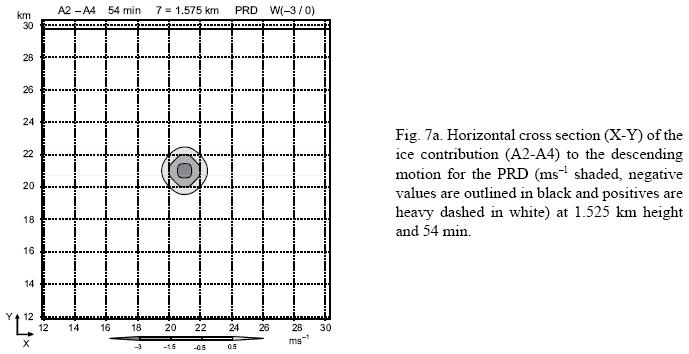 Even if these results preclude to apply the Stein and Albert's (1993) methodology to properly compute all the Ei algorithms, it proved to be useful to analyze the effect of the ice in the three main downdrafts in the presence of wind shear (analyzing A3 and E4 fields) at the time and level where they maximize in experiments A1 and A3, and to isolate the ice effect in the PRD and P in the absence of wind shear (analyzing E2 difference fields) at the time and level at which these two downdrafts maximize in the A2 and A4 experiments.