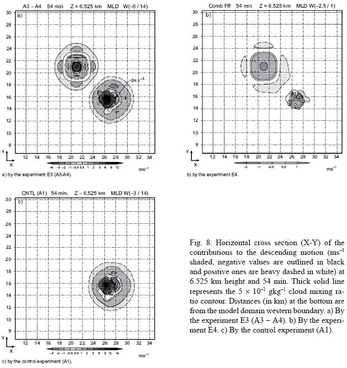 The ice effect field given by E2 exhibits a contribution of3 ms1 (Fig. 7a) to the total magnitude of9 ms1 attained in the A2 experiment (Fig. 7b). According to results in the experiment A2, this downward motion is mainly forced by the collective effects of precipitation loading, melting of graupel/hail (switch off in A4) and the evaporational cooling. Concerning the P downdraft in the experiments without environmental wind shear, it is reproduced in A2 (Fig. 7b), where the upper part of the cloud presents its larger horizontal extent, whereas is not present in the already extremely narrow cloud in A4 (not shown). In A4 there is only a pair of downdrafts to the side of the cloud which corresponds to the compensating motions in the environment.