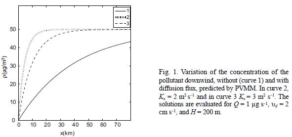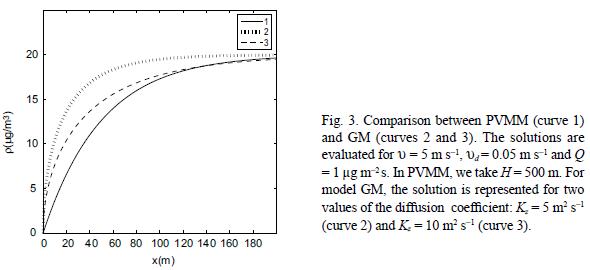 Figure 3 displays the downwind behavior of the concentration calculated with PVMM (curve 1), and the one calculated with GM at the emission height z = h, for two different values of the vertical diffusion coefficients, Kz = 5 m2 s1 (curve 2) and Kz= 10 m2 s1 (curve 3). The solutions are evaluated for