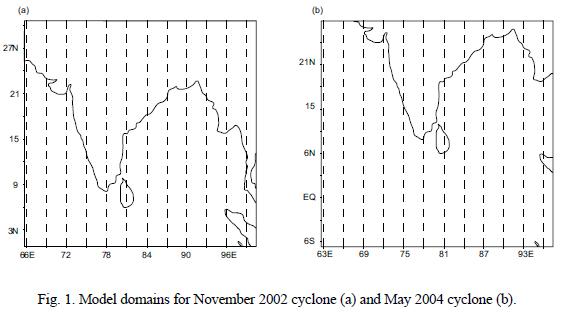 The MM5 model (Grell et al., 1994) utilized a single domain with 30 km (130 X 118 grid cells in eastwest and in northsouth directions) horizontal resolution and 23 sigma levels in the vertical direction. Figure 1a depicts the model domain for the November 2002 cyclone while Figure 1b shows the model domain for May 2004 cyclone. The model physics options used for this study are mixed phase Reisner scheme for explicit moisture, Grell scheme for cumulus parameterization and medium range forecast (MRF) scheme for planetary boundary layer. The model utilized a cloud radiation scheme and a multi level soil model. The MM5 model utilized the NCEPfinal (FNL) analysis data available at a horizontal resolution of 1° x 1° latitude and longitude and a time interval of 6 hours for the initial and lateral boundary conditions. Two numerical experiments were designed to bring out the impact of ingesting and assimilating AMSU and HIRS temperature and moisture profiles data on the forecasting of a tropical cyclone formed over the Bay of Bengal from 24 to 27 November 2002. In the control (CTRL) experiment the model is integrated from 24 November 06UTC to 26 November 00UTC in a free forecast mode. In the fourdimensional data assimilation (FDDA) experiment the model is integrated from 24 November 00UTC to 24 November 18UTC with improved initial conditions by the assimilation of AMSU temperature and moisture profiles. The model has been nudged throughout this period. From 24 November 18UTC to 26 November 00UTC the model is integrated in free forecast mode. Similarly, another two experiments were designed for the prediction of the tropical cyclone formed over the Bay of Bengal during 1518 May 2004. In the CTRL run the model is integrated from 15 May 06UTC to 17 May 2004 00UTC. The FDDA experiment was designed such that the AMSU and HIRS temperature and moisture profiles are ingested and assimilated at 15 May 06UTC and 15 May18UTC. From 15 May 18UTC to 17 May 00UTC the model is integrated in free forecast mode.