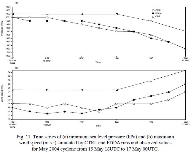 Figure 5 shows the time series variation in minimum SLP and MWS of model simulation and observation from 24 November 18UTC to 26 November 00UTC. The observed minimum SLP and MWS remained constant during this period. The observed values of minimum SLP and MWS are estimations based on satellite observations (Mishra and Gupta, 1976). However the model forecasted minimum SLP and MWS varied with time. From this figure, it is very clear that the minimum SLP simulated by the FDDA experiment remained closer to the observations throughout the forecasting period. It can be noted from this figure that the minimum SLP simulated by the FDDA experiment is lower by 1 to 2.5 hPa when compared to the minimum SLP simulated by the CTRL experiment. Further, the lowest SLP value attained in the FDDA experiment is 1002.5 hPa, which is closer to the observed 999.0 when compared with the lowest SLP of 1004.5 attained in the CTRL experiment. The observed MWS remained constant at 17 m s1 during 24 November 18UTC to 26 November 00UTC. The MWS simulated by the FDDA experiment varies between a minimum value of 14 and a maximum value of 21 m s1 while that of CTRL varies between 12 and 18 m s1.