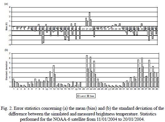 Figure 2 shows the error statistics concerning the mean (bias) and the standard deviation of the difference between the simulated and the measured brightness temperature. In practice, these errors are caused by various sources such as forward models approximations and measurement errors, among others (Uddstrom and Mcmillin, 1993). As expected, the error levels vary considerably from channel to channel. The accuracy also depends on the surface type (sea and land). In general, surface channels yield the worst result due to their high sensitivity to surface parameters such as the emissivity and the surface temperature. The channels associated with the water vapor absorption band (moisture channels) also show a larger error (stdanderd deviation). We can also see that the values of standard deviation are higher over land, especially in the AMSU channels. This occurs because the surface parameters have lower variability and are easier to be estimated over the sea. However, one can notice that the forward model underestimates the brightness temperature, although a bias correction scheme was applied in the measured brightness temperature prior to its use in the inversion process.