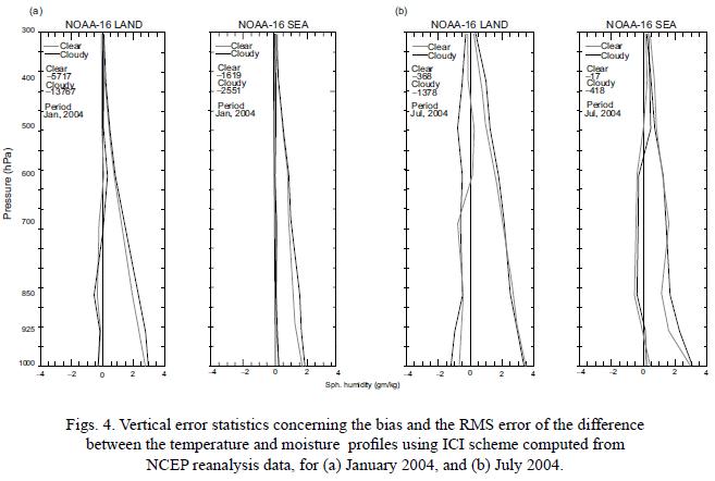 The vertical accuracy statistics based on satellite and NCEP reanalysis were computed from the collocations for NOAA16 satellite data for the period of January and July 2004. The statistics were made from total collocations, which include the types of land and sea, and clear and cloudy conditions. The atmospheric profiles retrieved by ICI are within the sensor specifications, which foresee over all errors of up to 1.5 K for the temperature profiles and 1.5 g kg1 for the moisture (Lavanant et al., 1999b). The results illustrated in Figure 3 show the bias and RMS error of temperature profiles retrieved using ICI over land and sea for January and July 2004. All of them had similar RMS error in the lower troposphere (below 850 hPa) in clear and cloudy conditions with values about 3.2 K over land and about 2.0 K over sea. The bias and RMS errors are small over the sea compared to that of the land in both situations and for both months. This is because of constant emissivity over the sea compared to highly variable emissivity over land.