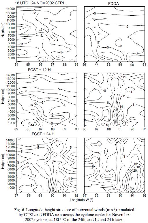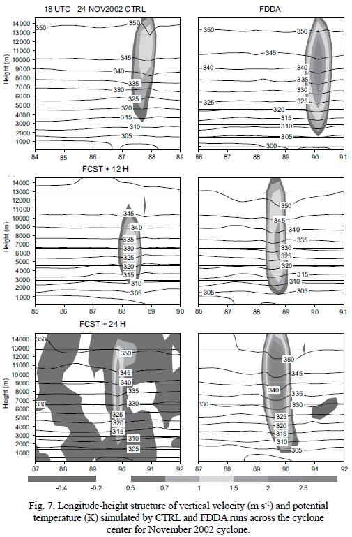 Figure 6 depicts the longitudeheight structure of the horizontal wind speed across the center of the cyclone at 24 November 2002 18UTC and at 12 and 24 hours of forecast (FCST). It can be observed from this figure that though the simulated system was weaker at the initial time, it became stronger at later times. It can be observed that at 12 hours of FCST, the asymmetric structure of the cyclone is very well produced in the FDDA experiment, which is also very strong in terms of wind speed when compared with the corresponding FCST of CTRL experiment. At 24 hours of FCST, both CTRL and FDDA simulations produced the asymmetric structure of the system. However the FDDA is stronger in teRMS of wind speed. Figure 7 illustrates the longitudeheight structure of vertical velocity and potential temperature close to the cyclone center. It is expected that the assimilation of AMSU temperature and moisture profiles will improve the simulation of thermodynamic structure of the cyclone. This is supported by the fact that the thermodynamic structure of the system as simulated in the FDDA experiment is stronger than that simulated by the CTRL experiment throughout the FCST period. From this figure, it is very clear that the middle to upper tropospheric warming as manifested by the presence of the warm core is stronger in the FDDA simulations. Furthermore, the vertical velocity is also stronger in the FDDA simulations for the entire FCST period. The above results are in general agreement with the previous study of Sandeep et al. (2006).