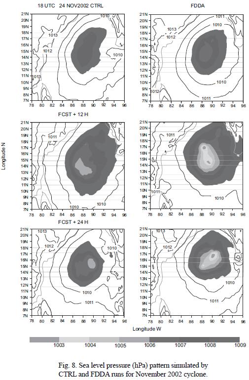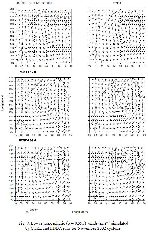 Figure 8 depicts the SLP patterns at 24 November 18UTC and 25 November 2002 06UTC and 18UTC, respectively. It is very clear from this figure that the FDDA simulation produced a stronger cyclonic system in teRMS of SLP except for the initial time. At 12 and 24 hours of FCST the FDDA simulated a minimum SLP of 1003 hPa while that of CTRL is 1006 hPa for the corresponding FCST period. Figure 9 depicts the lower tropospheric (o = 0.995) winds at 24 November 18UTC and 25 November 2002 06UTC and 18UTC, respectively. This figure show that both CTRL and FDDA simulations could produce cyclonic type of circulation throughout the model integration period. However the wind produced by FDDA simulation is stronger.