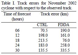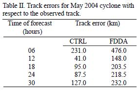 Figure 10 shows the 24 hour accumulated precipitation produced by CTRL and FDDA simulations and the Tropical Rainfall Measuring Mission (TRMM) estimated 24 hour accumulated precipitation at 25 November 2002 18UTC. Both CTRL and FDDA runs overestimated the amount of rainfall. The maximum accumulated rainfall amount for the 24 hour period from 24 November 18UTC to 25 November 18UTC estimated from TRMM satellite observations is 15 cm, while the CTRL and FDDA simulations produced greater than 30 cm of rainfall for the corresponding period. However, it can be observed that the pattern of the rainfall produced by the FDDA run has a close resemblance with the TRMM observed rainfall pattern. Table I shows the average track error in km of CTRL and FDDA simulations with respect to observed track for the November 2002 cyclone. It can be noted that in the FDDA simulation, the track error is reduced by 37 and 137.5 km at 12 and 18 hours of forecast. However, the track error of FDDA simulation has increased at 24 and 30 hours of forecast.