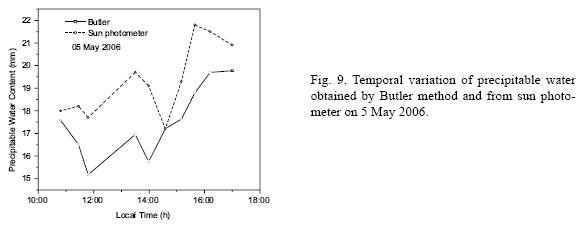 On 5 May 2006 the sky was mostly clear in the forenoon hours and small patches of clouds started appearing in the afternoon around 14:00 h LT. Simultaneous observations of sun photometer and surface meteorological parameters are available from 10:45 until 17:00 h. Figure 9 shows temporal variation in PWC obtained from sun photometer and that estimated by Butler method. It is broadly seen that there is a very good agreement between the two observations. After 14:00 h when scattered cloud patches started appearing in the sky, both observations showed a significant increase in PWC. Precipitable water derived from sun photometer varied from 16 to about 24 mm by evening. The magnitude of PWC values is rather high and is typical of premonsoon/monsoon conditions. It is to be noted here that on this day, PWC values from sun photometer are higher compared to that estimated from surface parameters, unlike in the longterm averages described earlier, where Butler method estimations were almost always higher than those PWC retrieved from Microtops sun photometer.