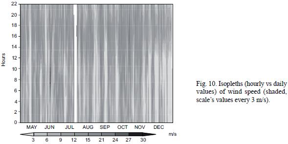 Wind speed (Fig. 10) in November, December, and early January was weaker compared to the total record; the summertime mean wind speed was 5.85 m/s. In winter, the increased humidity was apparently not due to the direction but to the intensity of the wind, as a rise in wind intensity causes a rise in humidity. This increase in the wind speed reflects a northward shift of the subtropical jet, which is typically found around 25°S in June.