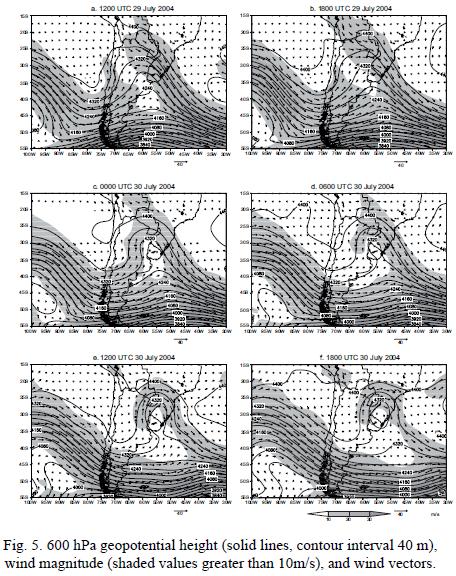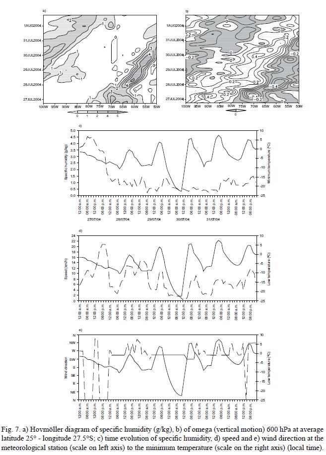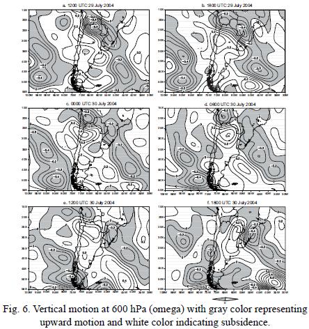 A typical cold surge occurred on July 30 2004, when the weather station recorded an average minimum temperature of –10.1°C. NCEP–NCAR maps of 600–hPa hourly geopotential height and wind speed, from 1200 UTC, 29 to 1800 UTC, 30 July, are shown in Figure 5. A deep trough dominated the circulation over most of Argentina during the previous day (Fig. 5 a–c). During the morning of July 30 the trough has positioned east of the country, with speed winds less than 10 m/s. Hourly surface observations provide additional data to validate the reanalysis. During the days associated with the cold surge, the weather station located at 4000 m.a.s.l. shows a sharp drop in temperature until it reaches the minimum value on July 30, at approximately 10:00 h. (Fig. 7c–d), from the previous day. The record exhibits smooth winds from WSW direction (Fig. 7 d–e), which favors the early morning cooling radiative, which results in a considerable minimum temperature. The Reanalysis also showed the strong subsidence in the region a few days earlier (Fig. 6), with consequent dryness at mid–levels (Fig. 7a), which in turn the records of the meteorological station verified (Fig. 7c).