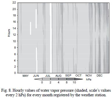 Between September and December, most of the absolute minimum temperatures were recorded at 8:00 h (all times are expressed as local time), while between June and August occurred between 8:00 and 10:00 h. The absolute maximum temperatures were registered generally at 16:00 h every month. The highest absolute maximum temperature was 21.3°C, at 16:00 h on December 8, 2004. We must remember that the time span two hours of recording measurements, from which the representative values of the variables are extracted.