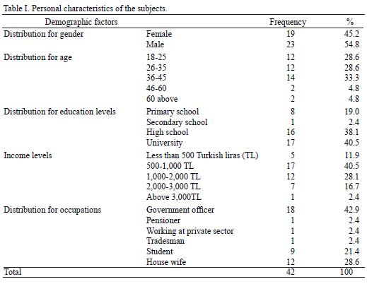 In the first part of the questionnaire (Section A), personal characteristics of the participants were investigated, which are presented in Table I. As can be seen from the table, 23 (54.8%) of 42 volunteers were male; 14 (33.3%) were between 36 and 45 years old; 17 (40.5 %) were university graduate; 17(40.5 %) were at an income level between 500 and 1,000 Turkish liras and 18(42.9%) were government officers (Table I).