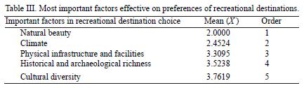 In the third part of the questionnaire (Section C), participants were asked to rank the choices of the questions about 1) the effective factors in recreational and tourism destinations on their preferences (e.g. climate, natural beauty, physical infrastructures and facilities, cultural diversity, historical and archaeological wealth); and 2) the factors negatively affecting their recreational activities (e.g. economic conditions; family structure, working conditions, climate of the destination, season, accessibility).
