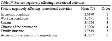 According to the answers given by the participants to the second question in Section C by ranking the factors, it was found that economic conditions of the participants are the most important factor negatively affecting recreational activities while the accessibility of the destination is the least effective one. Season and the climate of the destination are in the third and fourth row, respectively (Table IV).