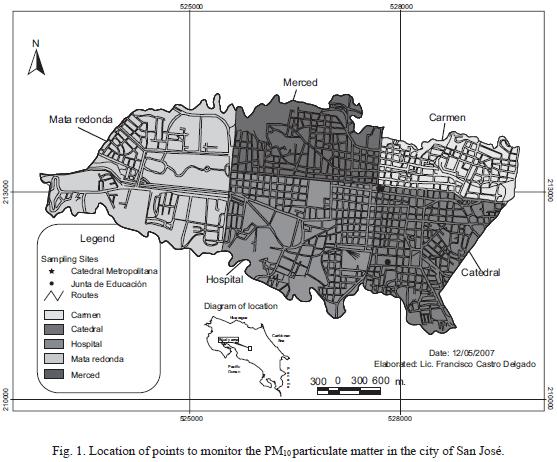 For the sampling of the PM10, two monitoring sites (category B, according to the classification of the Environmental Protection Agency of the United States) were selected in the city of San José (Fig. 1). Category B refers to sites with high concentration of pollutants and low accumulation potential, located 3 to 15 m from a high vehicular traffic flow artery, with good natural ventilation.