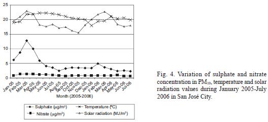 Figure 4 shows the nitrate and sulfate monthly medians variations in PM10 for the whole study period, together with some meteorological parameters (temperature and solar radiation). Sulfate exhibits the seasonal variation observed with a dry season maximum for PM10 because of an increase in the SO2 oxidation rate under high insolation conditions. The correlation coefficients between the monthly median percentage contributions of sulfate to PM10 and solar radiation are 0.685 (p < 0.02). Nitrate concentrations in PM10 (Fig. 4) do not show the expected seasonal variation characterized by a dry season minimum caused by the thermal decomposition of ammonium nitrate respect to the average value obtained for the rainy season.