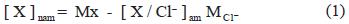 where the expression [ X / Cl ]am denotes the mass relation of X ion with respect to Cl in seawater, Mx and MCl ion X and Cl concentration in PM10. The mass relation of SO42 with respect to Cl in seawater is 0.108 (Berg and Winchestor, 1978). The difference between the ion concentration present in particles and component due to marine contribution corresponds to the fraction originated by different sources to the marine aerosol [X]nam. Examining the case of SO42, it appears that approximately 87% of mass concentration of this ion has a different origin to marine aerosols. On the continent, the fraction of SO42 that do not comes from marine aerosol is a tracer of anthropogenic activities, burning of fossil fuels and volcanic emissions of SO2.