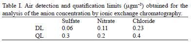 Standard dissolutions of calibration curve were run one time every 20 samples analyzed, together with a dissolution of quality control of 5 mg/L prepared from a certified Dionex synthetic sample. All the above steps were done in order to monitor the response and reproducibility of the peak and retention times. In addition, detection limits in ions were determined. To achieve this, 10 sample blanks of different filters measured once at a time, using the same analysis procedure applied to recollected samples, were analyzed. Detection limits were calculated by the concentration that generates a signal equal to the average of the signal of the blanks plus three times the blank's standard deviation. Table I includes the detection and quantification limits for the analytical method. Precision and bias of analysis were determined from quality control check samples prepared in the laboratory. For this study 7 equal strips of a single filter were spiked at two concentrations levels, in the lineal range of the method, and analyzed for soluble anions. Table II shows the bias and relative standard deviation for the analytical method.