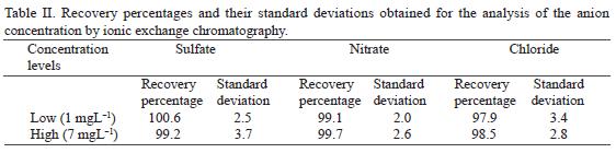 From 0.5 to 7 mgL1 of anions (sulfate, nitrate, and chloride) were quantified by interpolation in a calibration curve, under the following experimental conditions: eluent: solution 1.8 mmol L1 Na2CO3/1.7 mmol L1 NaHCO3 eluent flow: 2 mL min1 sensitivity: 10 µS.