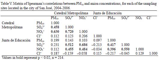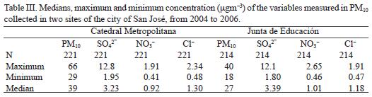 Table III shows the median as well as the minimum and maximum concentration of each of the variables analyzed in both sampling sites. As it may be observed, the median and maximum PM10 concentrations of the sampling period do not exceed the values established in the Costa Rican Decree on Immissions for Atmospheric Pollutants (30221S: Decreto de Inmisiones de Contaminantes Atmosféricos de Costa Rica), which are 150 (µgm3 for 24 h and 50 (µgm3 annual average. Nonparametric statistical methods were applied to all the inorganic anions and PM10 concentrations. Nonsignificant differences were found between sites for inorganic anions. The KruskalWallis statistics was applied at a 5% level, confirming these results. Despite there is no significative difference in the anions concentrations of the particles for both sites, there are significative differences for PM10 concentrations. This means that both sites are probably affected by the same sources but with different intensity. It is important to remember that the Catedral Metropolitana is in the central area of the city, a commercial area with high vehicular traffic flow while the Junta de Educación is located in a transition area, between the commercial and residential sectors of the Costa Rican capital.