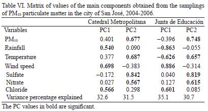 Analyzing the main components of the analytical data (PM10, SO42, NO3, Cl) and the meteorological variables prevailing during the sampling, we found that approximately 65 percent of the total variance, of both monitoring sites, may be explained by two factors. In both cases, the PC1 (Table VI) shows a strong relation between the wind speed and the chloride concentration. Therefore, and since the direction of the prevailing winds in the city is eastnortheast, from the Caribbean Sea, we may conclude that there is a primary marinebased contribution to this ion concentration. The PC2, for both sites, indicates an important relation between the sulfate, nitrate and PM10, which evidences the effect of anthropogenic activities on the city's quality of air.