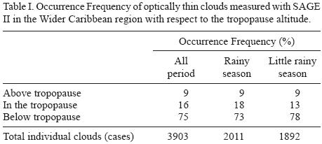 There is a seasonal behavior in the occurrence frequency of cirrus clouds measured with SAGE II in the Wider Caribbean region. The frequency is higher in the rainy period than in the little rainy months. The maximum values are 35.5% (rainy) and 17.2% (little rainy). The heights of these maxima are at 14.5 and 12.0 km, respectively. Above the altitude of the maximum of the occurrence frequency a minimum at an altitude close to 17.5 km is located. The values of these minima in the frequency of occurrence are 12% in both season. There are slight increases in the occurrence above the mean tropopause height in both rainy and little rainy seasons with respect to the minima value of occurrence at the tropopause. Kärcher and Solomon (1999) emphasized the continuum character of the cirrus/aerosols mixture systems in the neighborhood of the tropopause. The occurrence frequency above the tropopause in the Wider Caribbean region is lesser than in the whole tropical region, with a level of 95% of significance.