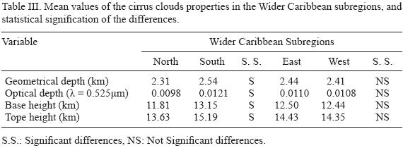 In order to evaluate the representativity of the characteristics of the cirrus clouds in the Wider Caribbean region, the comparison between different regions is carried out. Fourth subregions was selected, South (0 to 15° latitude), North (15 to 30° latitude), East (50 to 77.5° longitude), West (77.5 to 105° longitude). The contrast was made in the first case between the North and South subregions and the second one between East and West subregions. The result of the mean values for each subregion and the statistical significance in the differences with 99% of signification is shown in the Table III. There are differences statistically significant between North and South subregions in all variables. In the other hand there are not differences statistically significant between East and West subregions in all variables. When the cirrus clouds characteristics in the North and South subregions are compared, the highest, thickest, and optically densest clouds were the ones in the South subregion. The cirrus clouds in the West and East subregions have similar characteristics. These behaviors of the cirrus clouds characteristics follow the circulation pattern in the upper troposphere in the Wider Caribbean region. At this altitude the circulation become a zonal circulation and the surface influence over the circulation vanish. The air mass transport is dominated fundamentally by the zonal winds, and the winds from the Hadley cell. These winds spread from the south to north the moist air and the ice crystals present in the cumulonimbus anvil formed in the deeply convection areas.