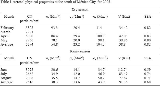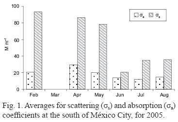 Table I shows the average for aerosols scattering and absorption coefficients, concentration of particles, single scattering albedo and visibility in dry (FebruaryMay) and rainy (JuneAugust) seasons. Values of scattering and absorption coefficients are higher during dry months than in the rainy season (Fig. 1). The averages over the sampling days of each month for σa present small variations, ranging from 20 Mm1 to 29.4 Mm1 and 12 to 14.7 Mm1 in dry and rainy seasons, respectively. However, the values for σs varied notably, 78.1 Mm1 to 93.3 Mm1 in dry season, compared with 20.6 Mm1 to 35.5 Mm1 during the rainy season. Fresh particulate emissions due to traffic in México City are mostly carbonaceous with very low sulfur content (Molina and Molina, 2002) therefore the absorption coefficients show small variations on both seasons.