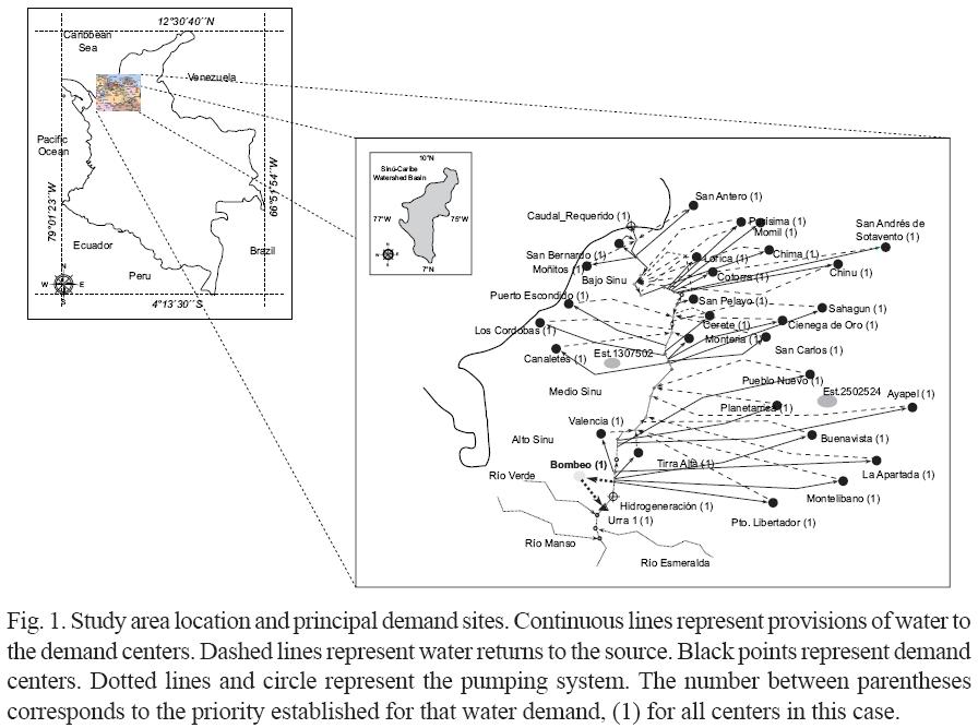 The study area is located approximately between 7 and 10° N latitude and 75° and 77° W longitude in NE Colombia. In Figure 1, the location and principal demand sites are presented, including the Urrá l reservoir and the future pumping station.