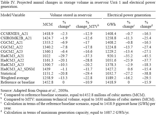 It is clear from the information shown in those tables and figures that all the models and scenarios project negative effects on flow in the basin, on the volume of water stored in the reservoir and on the generation of hydropower by the end of the 20102039 period. The projected supply yield for the different scenarios for the year 2039 is presented to cover the supply requirement or demand for the same year (636.1 millions of cubic meters MCM for all scenarios, see Table V) and the ratio for unmet demand is specified for each case. The new scenarios developed in this report are based specifically on the current or baseline scenario and the future weighted average scenario (see Table III), for the purposes of the proposed analyses.