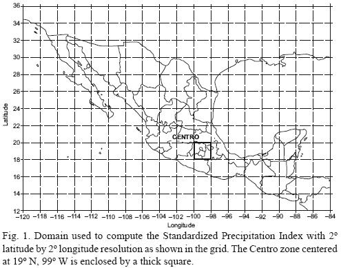The SPI (McKee et al., 1993,1995) is based on the probability of precipitation for a number of consecutive months, and its main objective has been to represent a deficit of precipitation over a local area on a specific time scale relative to its climatology. Although the SPI is not a drought prediction tool, the SPI methodology has been used to identify dryness and wetness conditions, and to evaluate their impact in the water resources and management. This study computes SPI values within the area shown on Figure 1, where the spatial resolution is 2° longitude by 2° latitude.